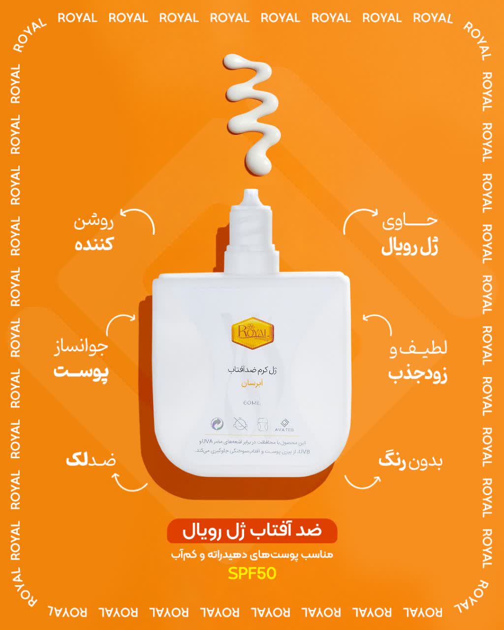 ضدآفتاب آبرسان رویال ، یک ضدآفتاب بیرنگ با بافت ژل کرم خنککننده با +SPF 50، مخصوص پوستهای تشنه! با قدرت آبرسانی بالا، پوست شما را همزمان از اشعههای مضر محافظت و بهطور عمیق آبرسانی میکند. مناسب استفاده روزانه و زیر آرایش است .